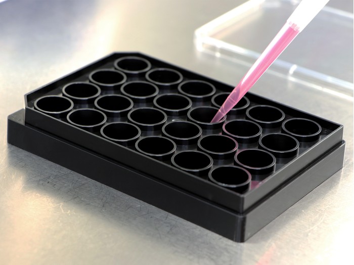 黑色24孔板,孔底為#1.5H玻璃蓋玻片,適用于利用TIRF全內反射熒光顯微鏡和超分辨顯微鏡進行高通量篩選。